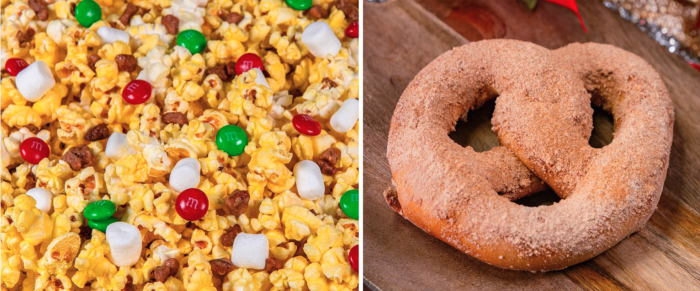 - Holiday Magic Popcorn: White chocolate-flavored popcorn with pretzel sticks, assorted M&M’S Milk Chocolate Candies, and crushed peppermint (New)