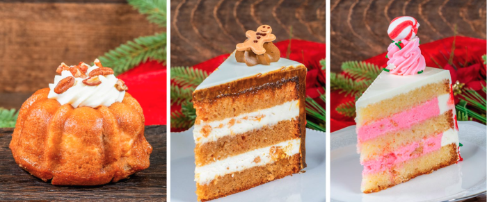 - Peppermint Cake: White cake soaked in peppermint simple syrup, layered with chocolate ganache, peppermint mousse, and peppermint crunch, and finished with buttercream, holiday sprinkles, and mint candy (New) (Available Nov. 15 through Jan. 6)