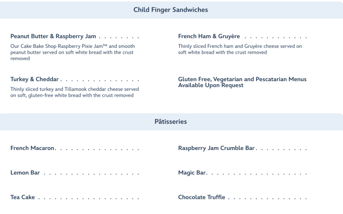 There are also three different child sandwich options that can be brought out, and six different patisserie options from the bakery. Sounds like quite the spread!