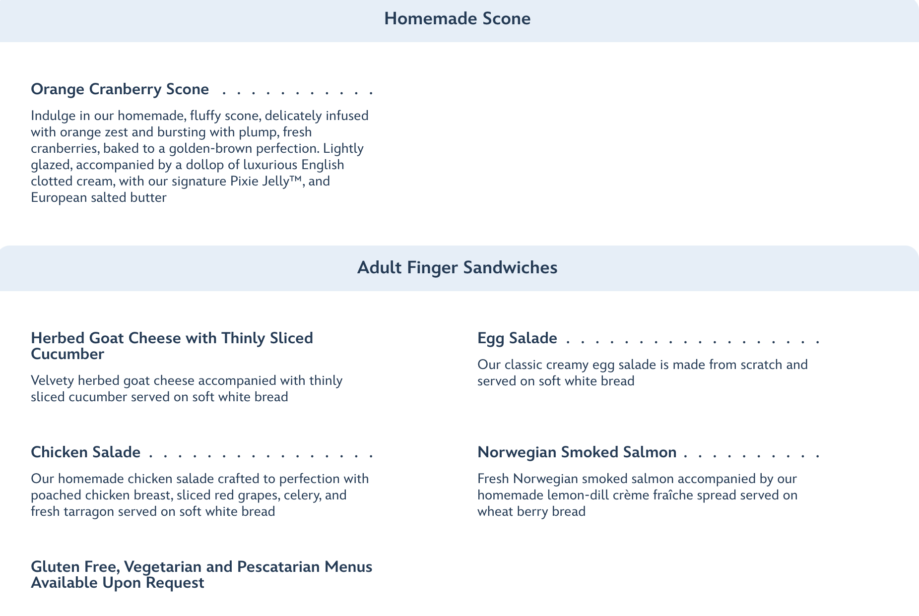 Wow. Just wow. The price of this is BONKERS. Our tradition every Mother’s Day was to go to the Grand Floridian for tea. We LOVED their finger sandwiches and scones. We never were very crazy about the dessert part and would have rather just enjoyed more finger sandwiches but the price was exactly where it should be for the experience. When the tea room didn’t come back after Covid, we were excited to see that a tea experience would be coming to the Cake Bake Shop. I realize the ambiance is a little fancier, but that price is just too much. The scone sounds delicious but there should be a traditional cream scone there too. I would take fewer dessert options to include a traditional scone. Ever since the first menu was displayed, I think they have been trying to see just how much people will pay to eat there. Given it took forever for the shop to open, I imagine their costs exceeded their expectations. But I think they will find that their prices in general are just too much to stomach. For these prices we could just go to the Ritz or Four Seasons.