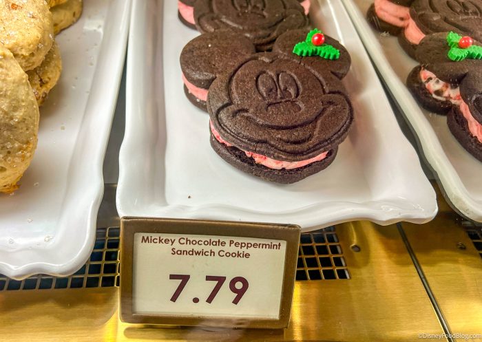 In bakery cases around Disney World, including at Big Top Treats, you’ll find the new Mickey Chocolate Peppermint Sandwich Cookie for $7.79. This is very similar to the mint chocolate version we’ve seen in the past, except it’s holiday-themed!