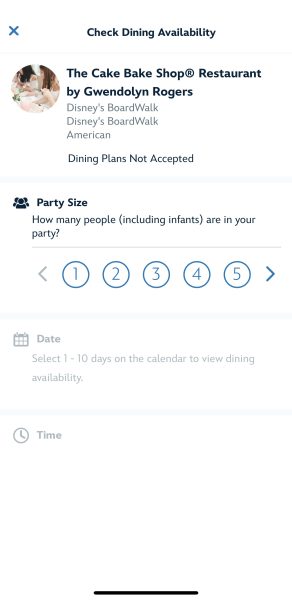 While you don’t need reservations to enjoy the bakery at The Cake Bake Shop, they are highly encouraged for the restaurant. While previous reservations were only available on OpenTable, you can now book your table on My Disney Experience via the app or Disney World website! On the website, simply click “Check Available Days,” and you can select open options for breakfast, lunch, or dinner.