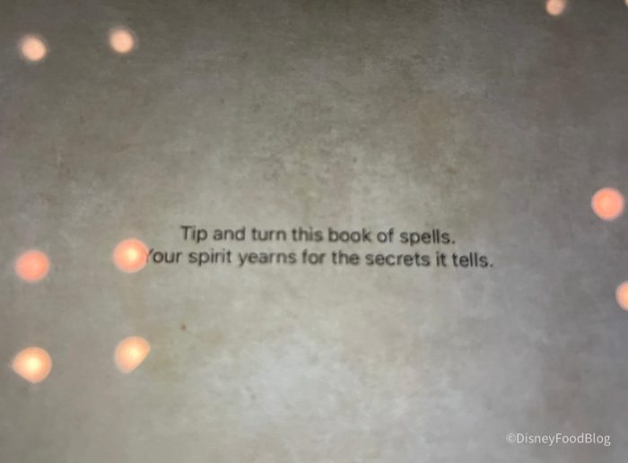 From what we saw, the menu is presented on a tablet and prompts at the bottom, “Tip and turn this book of spells. Your spirit yearns for the secret it tells.”