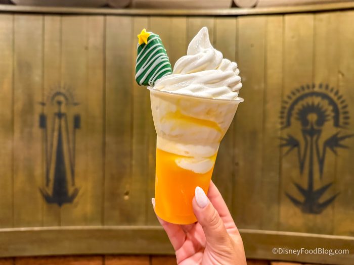 Okay, moving on to Mickey’s Very Merry Christmas Party. The Holiday Pineapple-Orange-Guava Juice Float is made with Pineapple-orange-guava juice, coconut soft-serve, and a spiced pineapple tree pop for $9. Yes, it’s a POG float with coconut soft-serve, but it didn’t wow us like we thought it would. We didn’t think it justified the $9 price tag either, and it wasn’t even all that festive other than a Christmas tree cake pop. It’s just…basic.