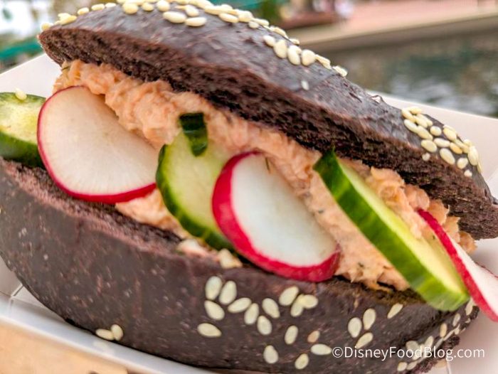 We first had this little sandwich last year and it was SO GOOD. It was a cold, salmon salad with fresh vegetables on the dill brioche — which was PACKED with flavor and was so soft. If you like salmon and dill, you should absolutely go for this. Salmon can be on the fishy side, but the addition of the cucumbers and the fresh lettuce helped to balance things out. We loved this last year, so how does it hold up this year?