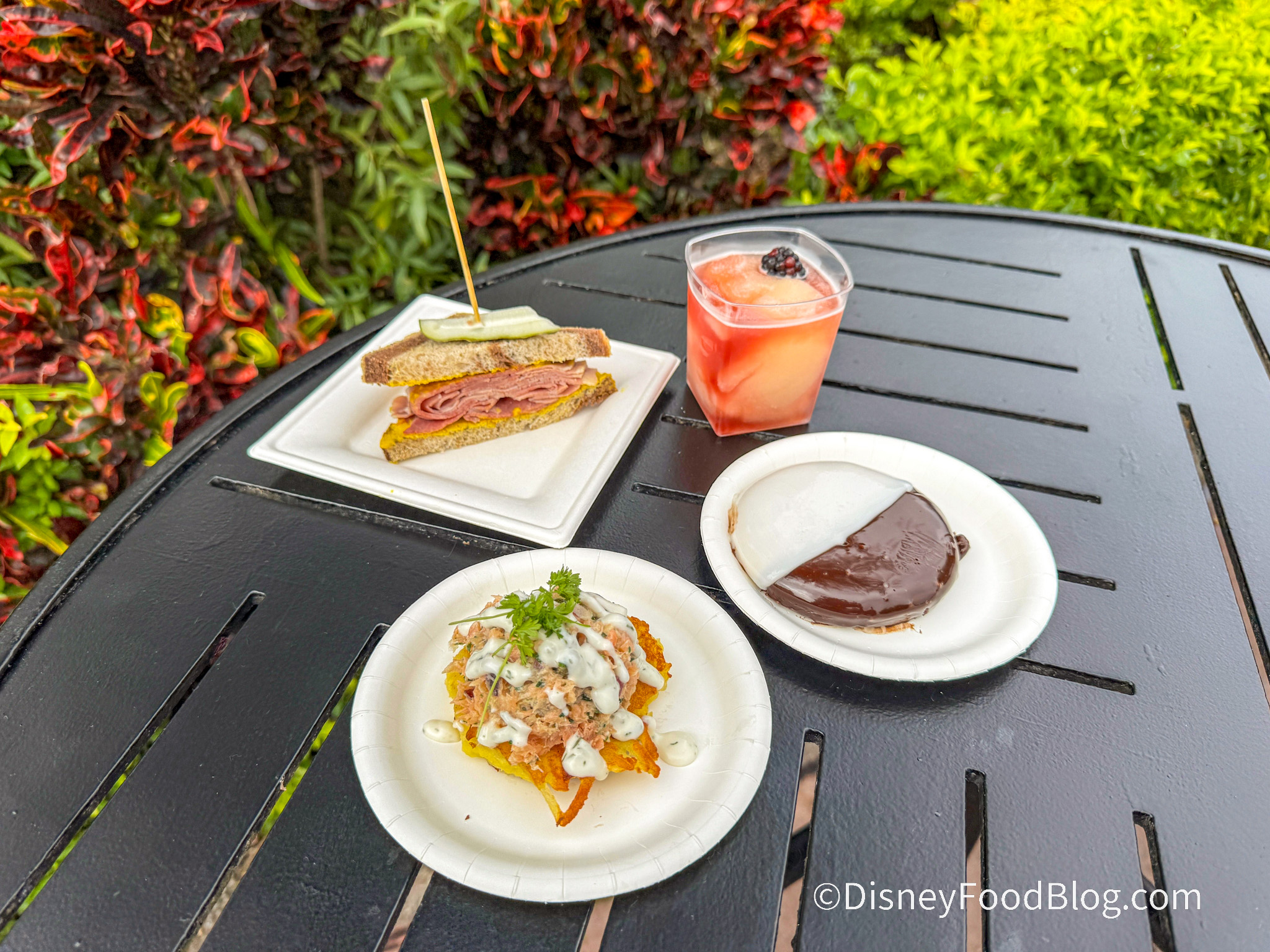 In terms of drinks at this booth, you can buy the Frozen New York Whiskey Sour featuring Manifest Whiskey and Manischewitz Blackberry Wine for $12.50. We gave this a try last year when it debuted, and we really liked it! This reminds us of a Moonshine Sour from the American Adventure pavilion. It was like biting into a blackberry — sweet, but then you get a sourness at the end.