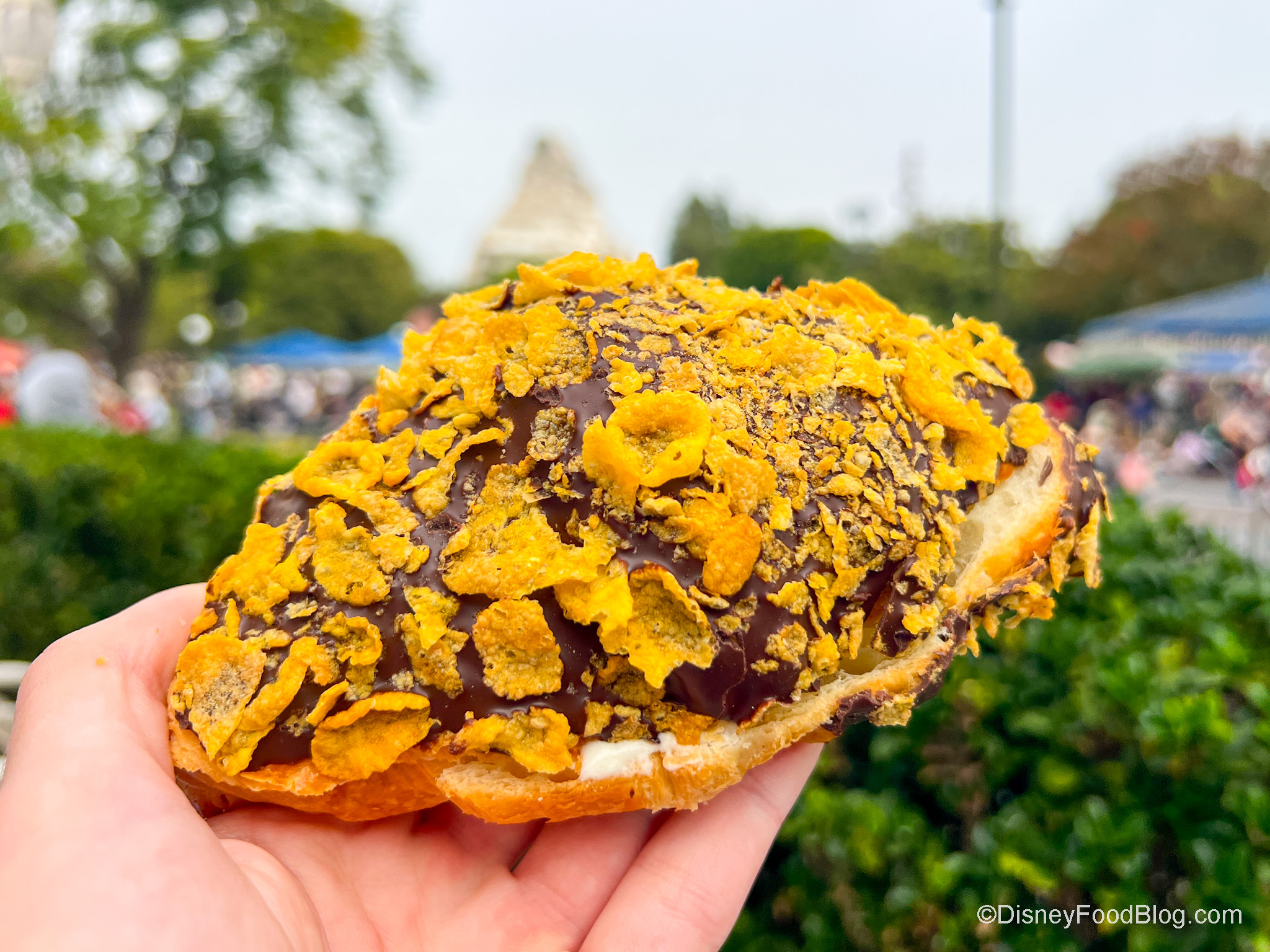 Jolly Holiday Bakery Cafe is a Mary Poppins-themed bakery that features pastries, specialty coffees, and tea in the morning. You can also grab salads, sandwiches, soups, and quiches in the afternoon. You will find this cute bakery on Main Street, U.S.A. We recently stopped by to try a Cripsy Chocolate Dipped Croissant topped with Flaked Corn Cereal. It was a delicious combination that we really loved!