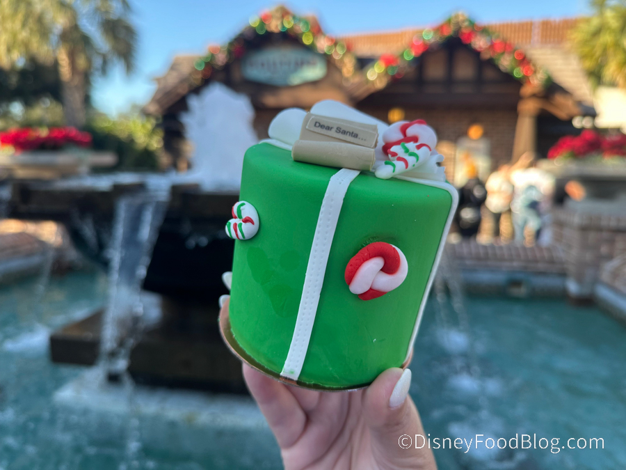 If you want a specialty holiday cake but don’t want to drop around $70, check out the Christmas Present Petit Cake! This cake is very similar to the Toy Soldier Mickey Dome Cake and is also made with chocolate chiffon, milk chocolate mousse, and coconut-pecan filling. However, this much smaller cake is $22 before tax, which is still expensive but a far cry from $67.