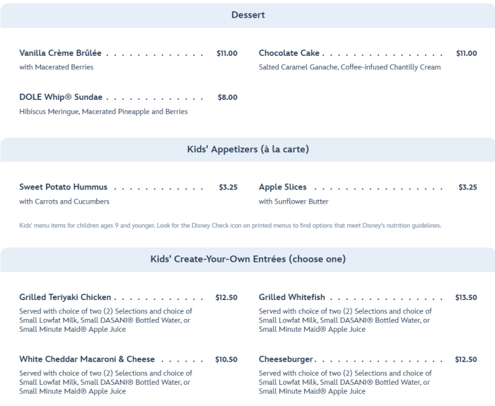 Well, now Disney has revealed the lunch and dinner menu for this restaurant. Here’s a list of just some of what you’ll find at the new restaurant.