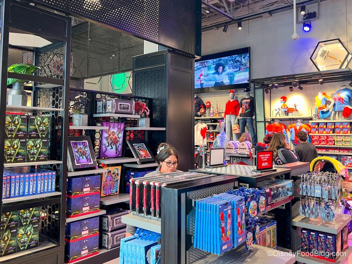 The store also features some cool details, like this Ghost Spider crawling across the ceiling.
