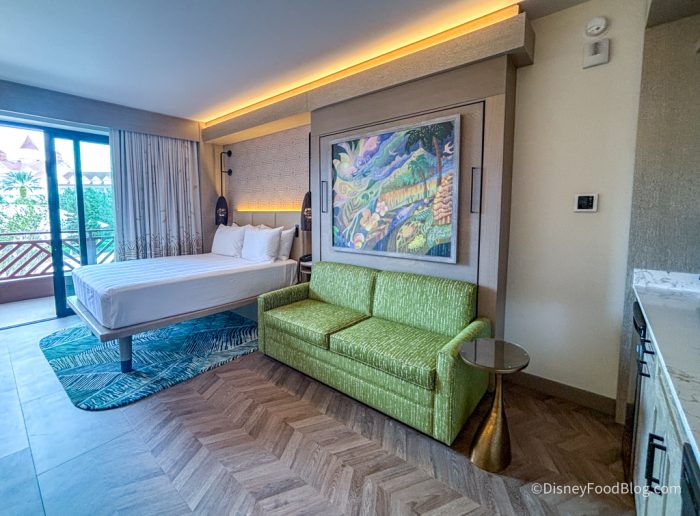 We stepped into one of the Deluxe Studios for a tour, and while the rooms are small, they pack quite a few offerings in the space. There’s both a queen bed and a murphy bed that turns into a couch.