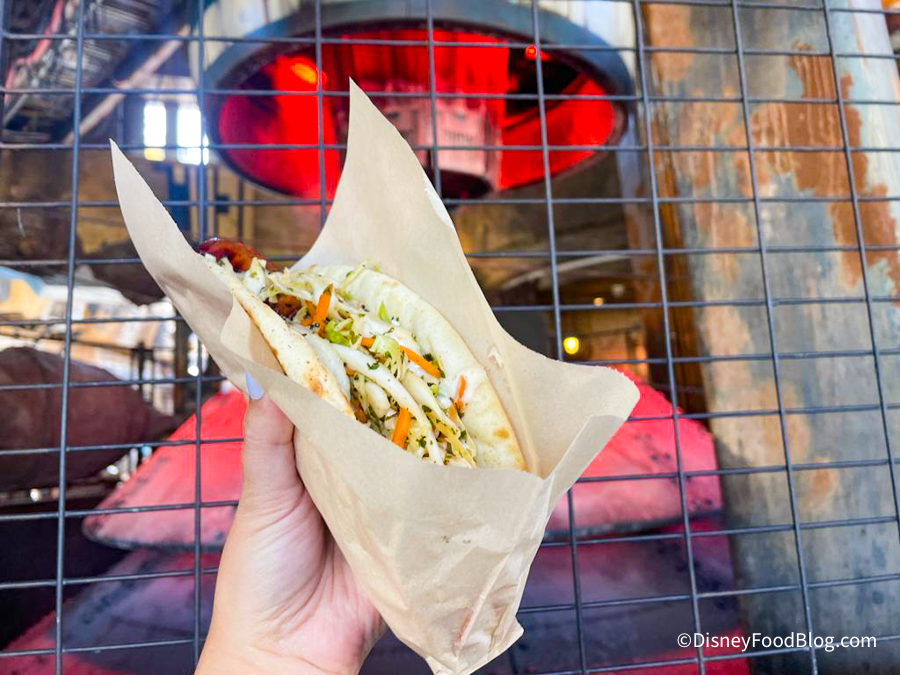 One of our favorite spots in this park is Ronto Roasters located in Galaxy’s Edge. The theming of this place really makes you feel like you’re in Batuu, and the food does too! You can grab their signature Ronto Wrap, made with Roasted Pork, Grilled Pork Sausage, Peppercorn Sauce, and Tangy Slaw wrapped in Pita Bread, for only $14!