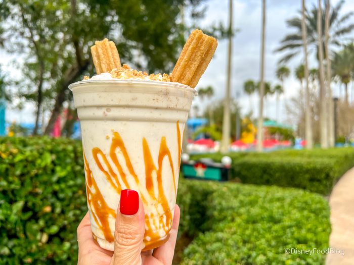 This was a standard vanilla milkshake with salted caramel sauce swirled around the cup, and then it was topped with bits of churros, a cherry, and two churros stuck into it. We didn’t mind waiting a little longer to get our shake for the fresh churros! Non-stale churros in Disney World are a bit of a delicacy, so we gladly waited to get fresh, hot ones in this shake.