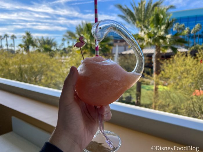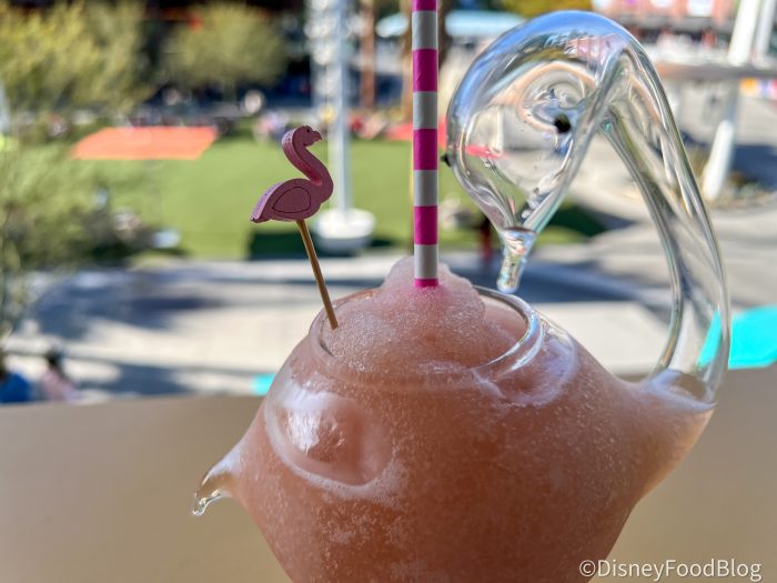 We thought this one was super light, refreshing, and tasted just like a rosé slushy. There’s a slight tartness but nothing about it overwhelmed us. We can see this one being a hit on a hot, sunny day and aesthetically it’s fun and great for photos. It also surprised us with how well its consistency held up against the elements! However, you’ll need to order this one at the bar if you want the flamingo glass, which you won’t get to take home with you.