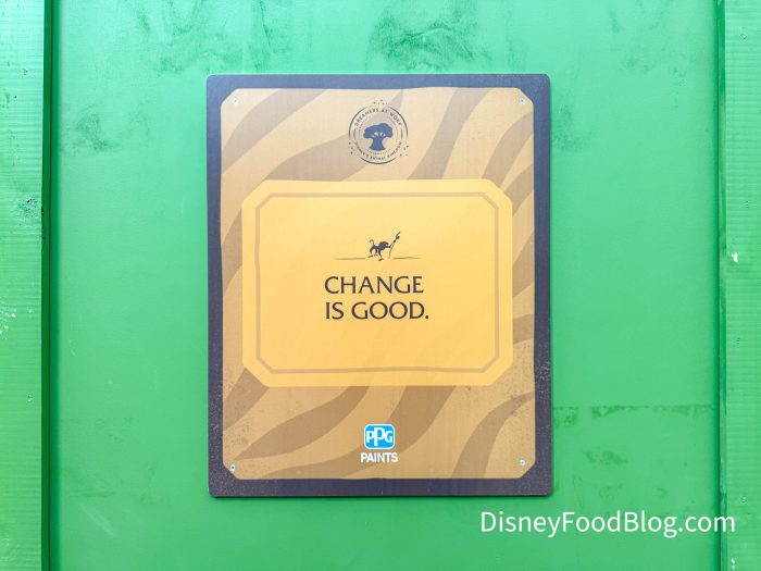 While we are excited about the changes, we won’t deny that this made us pretty sad today. Disney had a good reminder for us posted on some of the construction walls. On one of the walls, you can read, “Change is good” with Rafiki on top.