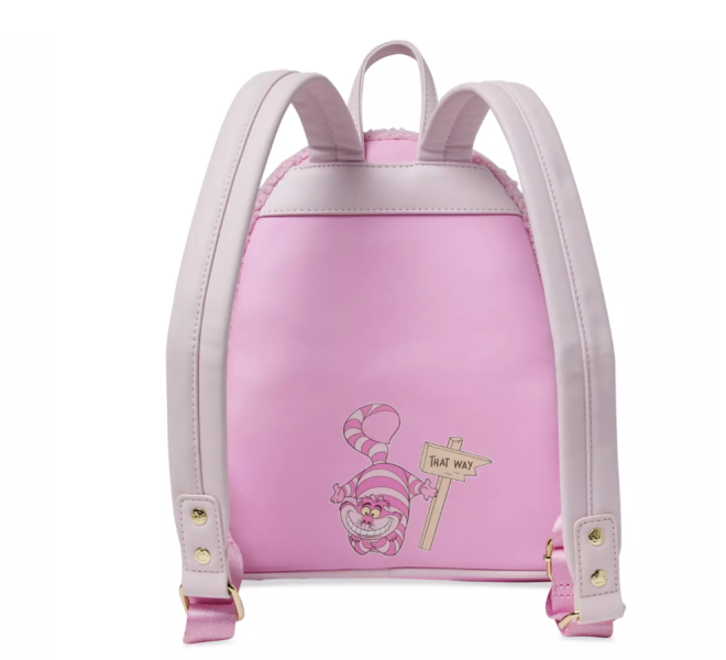 This backpack has the famous Chesire Cat grin across the front with fluffy dark and light pink stripes.