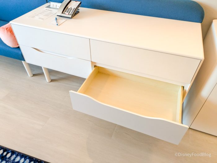 Need a place to sit or put your things? They’ve got you covered with a seating area right next to the dresser, which features plenty of space, a telephone, notepad and pen, and an informational guide to the hotel. Plus, there are pop-up outlets in the dresser!