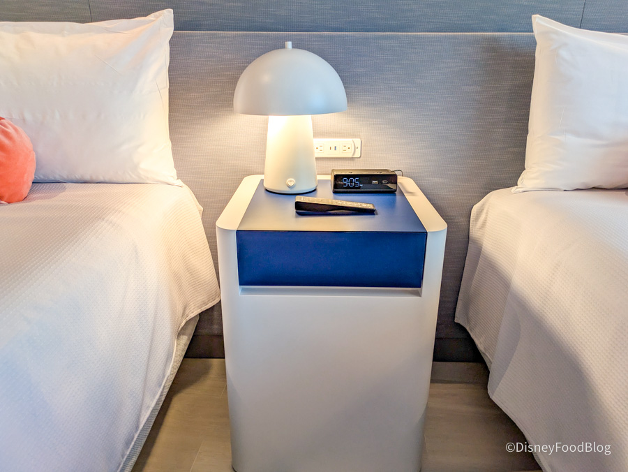 In between the beds, there’s a nightstand with a drawer and lamp, alarm clock, and plenty of outlets.