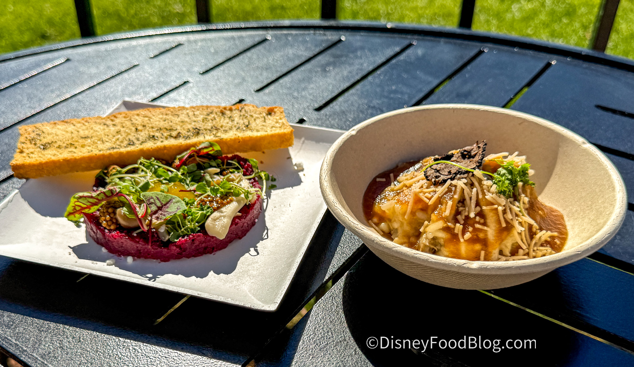 Last year, this was our favorite item at this booth! It’s plant-based, so that “parmesan” is really a coconut-based “cheese.” The dish was salty, delicious, creamy, and earthy. We even had to double-check with Cast Members that it is actually plant-based as it is super creamy!