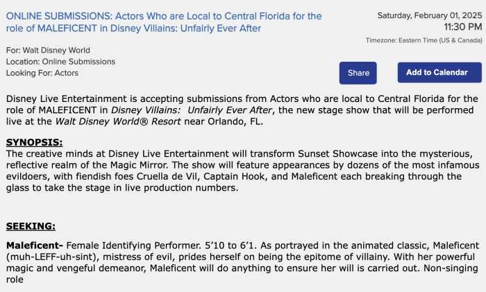 The role calls for a female presenting performer who is between 5’10 and 6’1. The listing reminds those auditioning that this villain is the “mistress of evil” who “prides herself on being the epitome of villainy. With her powerful magic and vengeful demeanor, Maleficent will do anything to ensure her will is carried out.”
