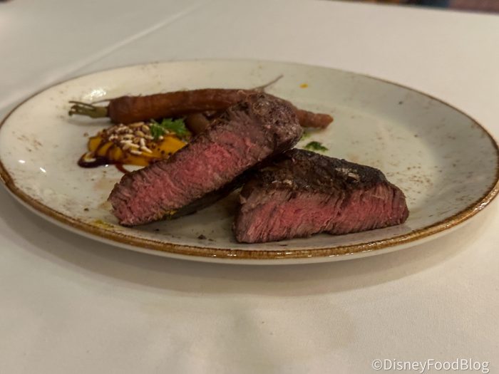 We opted to have our filet cooked to a medium temperature which means it was presented to us with a pink center to the beef — but don’t let that color fool you! This meat was so tender and definitely makes the shortlist of best filets among Disney World’s restaurants.