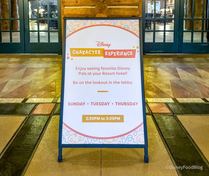 UPDATE: We’ve since spotted a similar sign at Disney’s Wilderness Lodge Resort! Based on what it says, you’ll be able to see characters on Sundays, Tuesdays, and Thursdays between 2:30 PM and 3:20 PM.