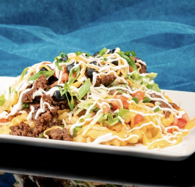 We aren’t stopping there, though. You can also find Loaded Taco Fries at Galactic Grill. This dish consists of crinkle-cut fries topped with refried beans, seasoned ground beef, spiced cheese sauce, shredded lettuce, tomatoes, olives, green onions, and a sour cream drizzle.