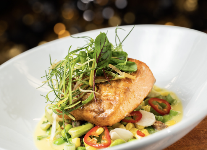 - Grilled Ōra King Salmon: Creamed corn succotash, pancetta, and Spring onion pistou