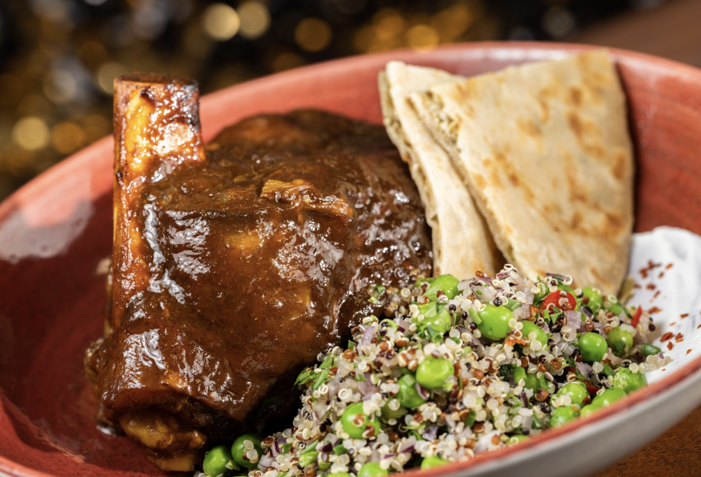 - Lamb Shank: Quinoa-pea salad, paneer paratha chips, and mint yogurt