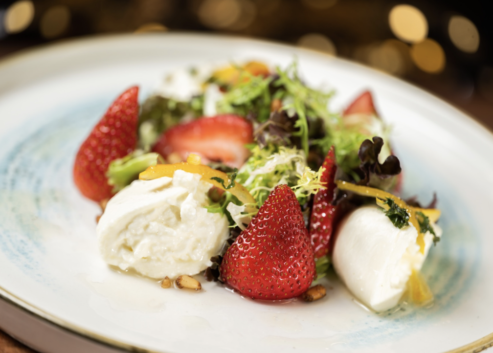 - Grand Marnier Liqueur-macerated Seasonal Fruit Burrata: Lollo rosso, frisée, caramelized spiced pine nuts, and citrus vinaigrette