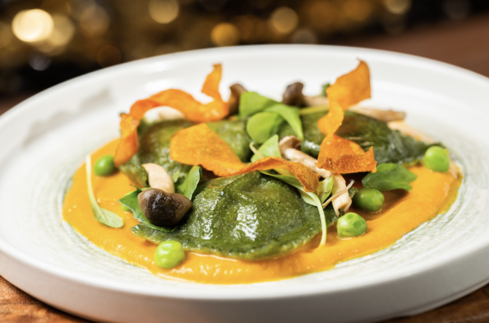 - House-made Ravioli: English peas, carrot purée, and pickled alba mushrooms