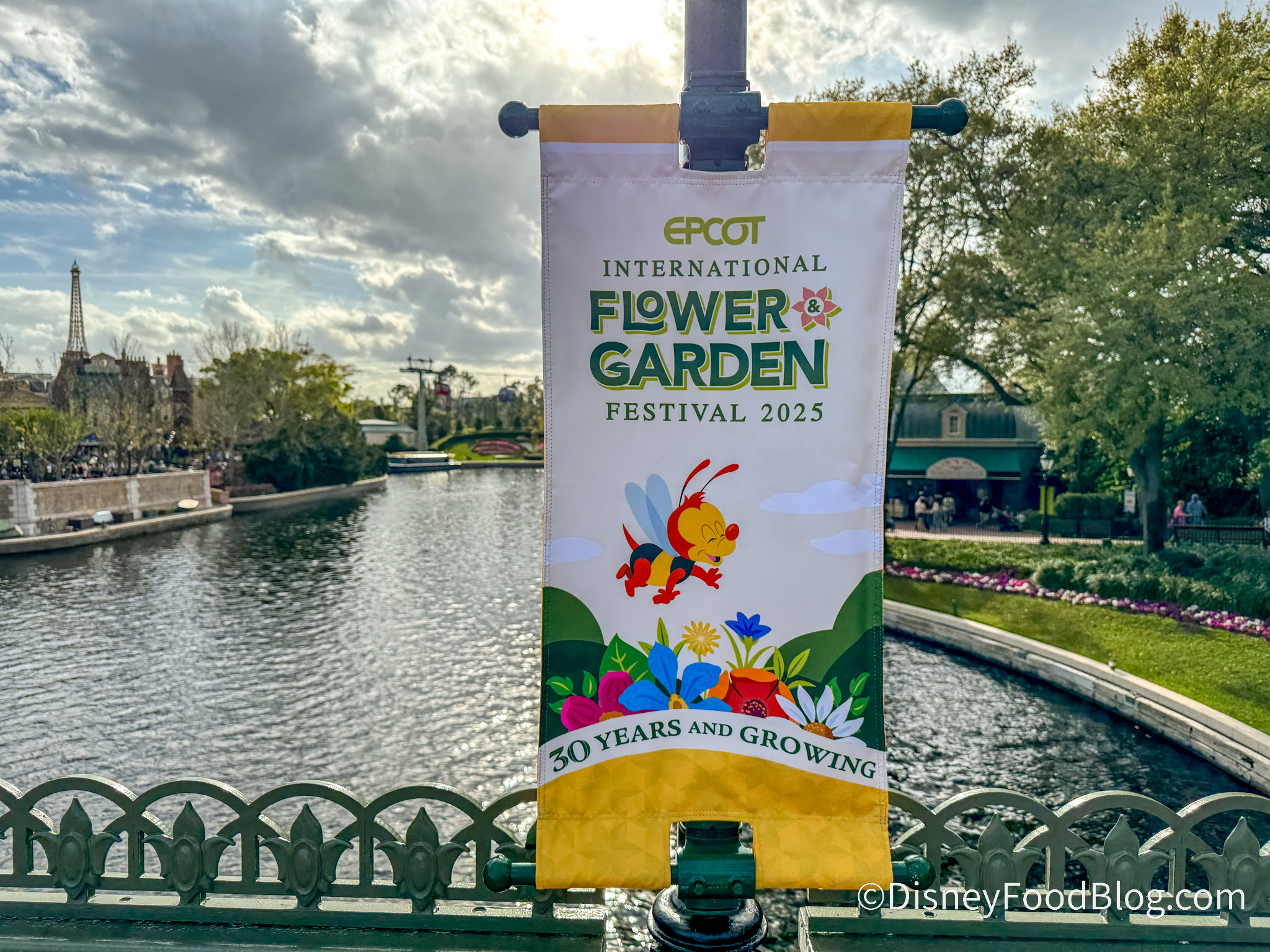 EPCOT is celebrating 30 years of the Flower and Garden Festival, so there are signs throughout the park with big “30s” on them! You will also find signs and decor featuring Spike the Bee throughout the park! The banners have the cute phrase “30 Years and Growing!”