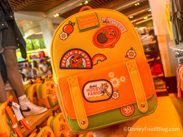 This adorable Loungefly backpack features patches with Orange Bird and Spike the Bee. Look closely, and you can spot the 30-year patch!