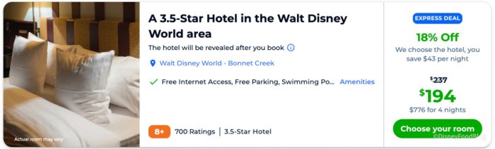But, they also have hidden deals known as Express Deals, where the hotel isn’t revealed until you pay. And, if you know what you’re doing and have decent detective skills, you can sometimes figure out which Disney World hotels are being offered with these deals.