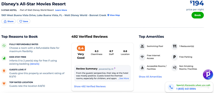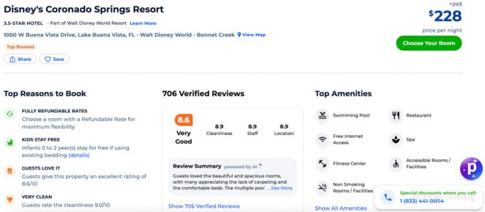 For example, we found a room for $194/night with 3.5 stars, 700 ratings, and 8+ average guest rating in the Bonnet Creek area. That narrows it down to potentially Disney’s Coronado Springs Resort OR Club Wyndham Bonnet Creek Resort. But when you click on the deal, it lets you look at the room, and you can see it’s not a Disney hotel.