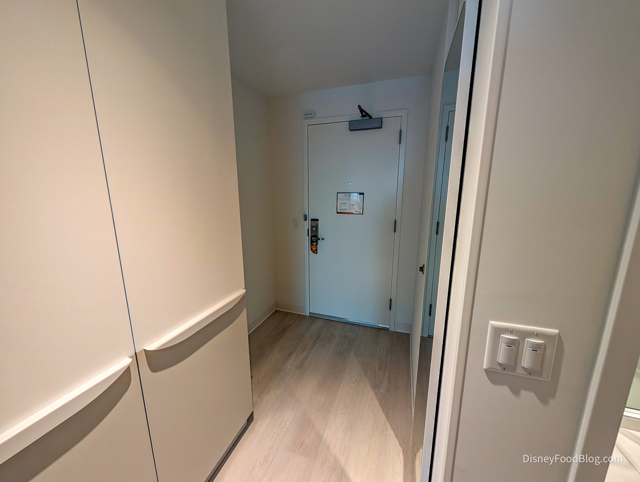 The room’s entryway has guests crossing between the bathroom and the closet before entering the main living space.