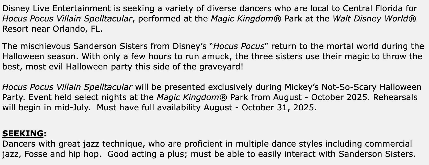 Disney recently posted an audition notice looking for a group of diverse dancers for the Hocus Pocus Villain Spelltacular. In particular, Disney is looking for dancers with “great jazz technique, who are proficient in multiple dance styles including commercial jazz, Fosse, and hip hop.” The notice also mentions that the dancers will be interacting with the Sanderson Sisters.