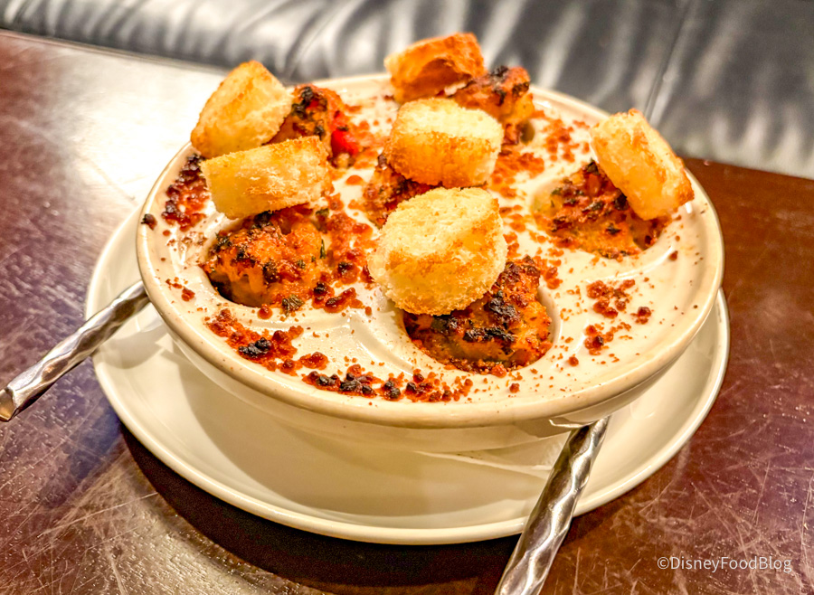 These were delish! They didn’t have a strong seafood flavor, the predominant flavor we tasted was red bell pepper for a nice bite. The saltiness of the bacon made these an addicting bite. They go perfectly with the cocktails in that “salty bite plus a drink” way like how peanuts at a dive bar pair well with a beer. The bread on top made us think it would be crispier like a crouton, but it was surprisingly light and fluffy inside.