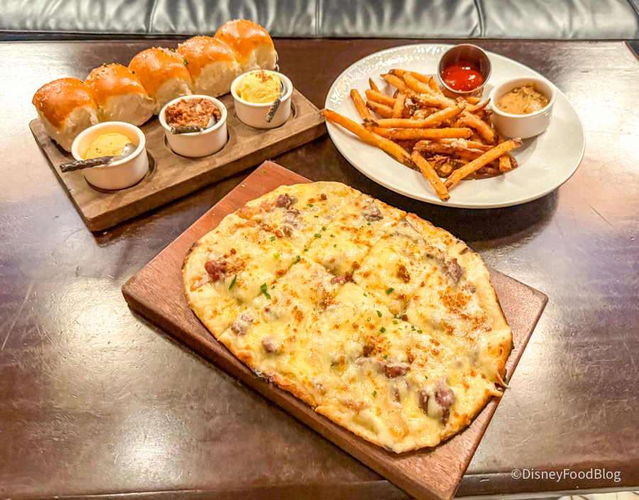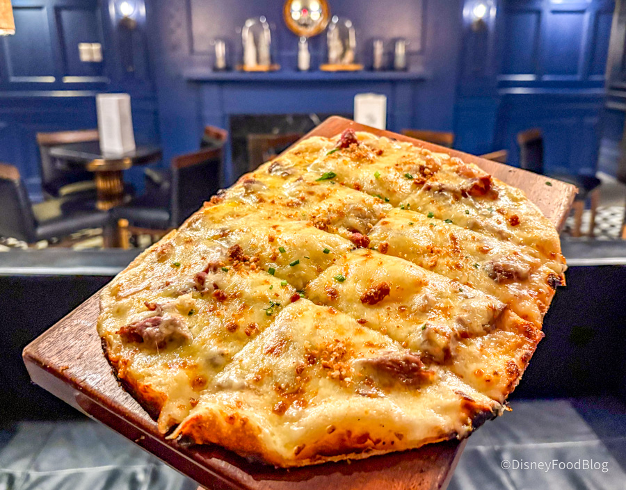 This was an interesting one! The cheese on the flatbread is a tiny bit funky but nowhere near something like a blue cheese level of funk — it was a strong Gruyère. It played really well with the sweet caramelized onions which are underneath the cheese and act almost like a sauce. The beef was tender and easy to bite through, and it kind of reminded us of when you get a Philly cheesesteak pizza — it had that shaved beef situation going on. The crust wasn’t very crispy on the bottom but it wasn’t soggy either. It had a great char on the bottom but it didn’t have the same crunch as we would expect given the color of the crust. But, it was soft and pillowy and we had no complaints about the texture at all!