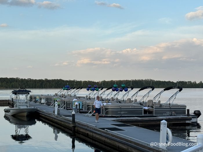 When you check in, a Cast Member who will be your captain will guide you along the dock to board your pontoon boat. This Cast Member will be along for the entire ride, and it can be super fun to chat with them and learn about the history of Disney World! The price of your cruise includes bottled water, sodas, and snacks. Alcohol is allowed on board, just not in glasses or glass bottles. Before boarding your cruise, you can head to the Sand Bar right outside the marina to pick up a drink.