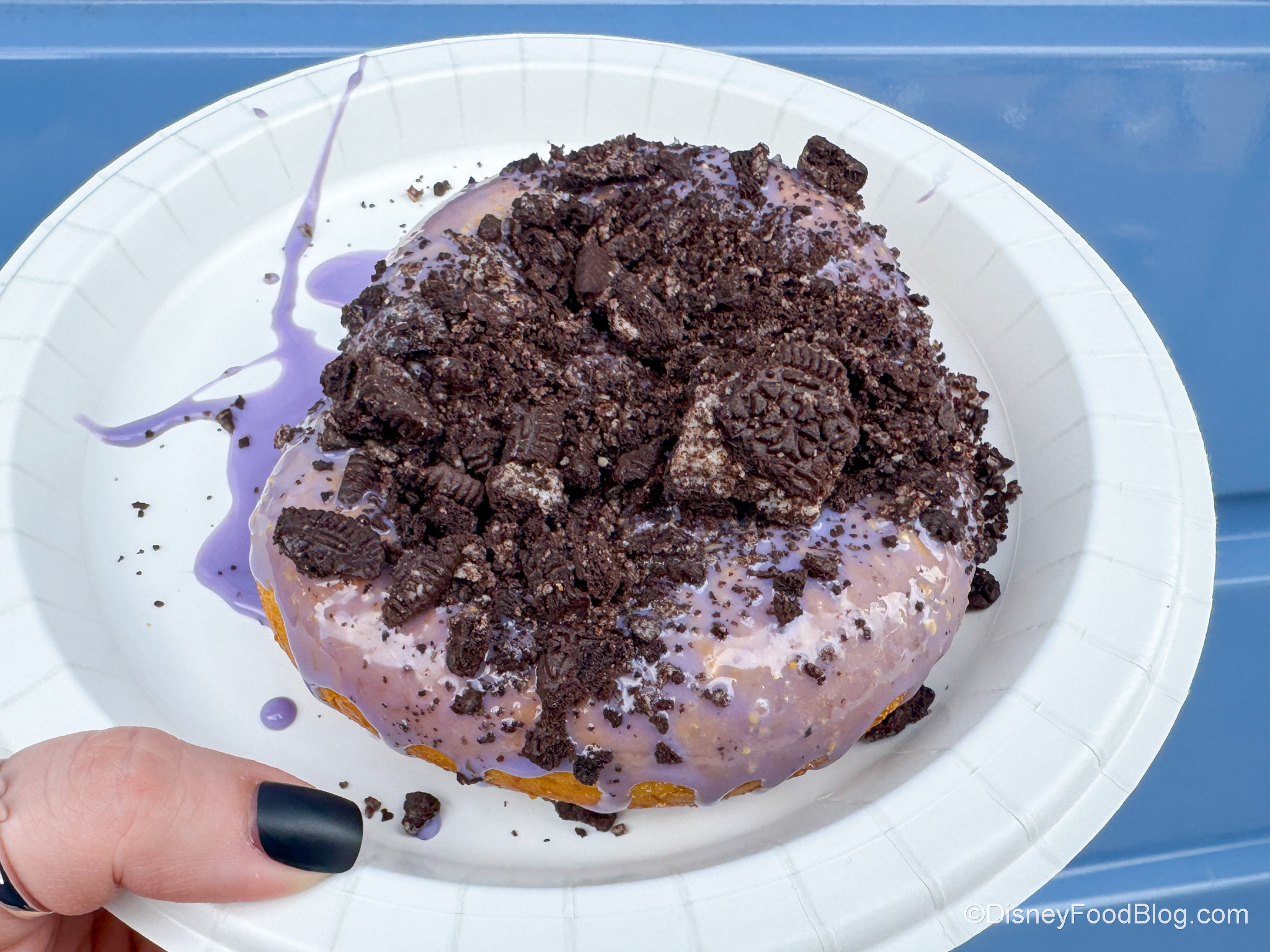 You’ve got a classic soft and gooey Disneyland cream cheese-filled pretzel, which is good on its own, combined with this nice cookie crumble texture with the sweet taste of taro and chocolate. It’s the perfect flavor and texture combination, and we will be getting this again. And again. And again.