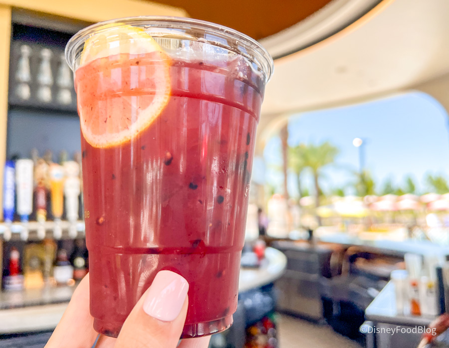 This was so fun! It’s a glass of prosecco with a popsicle upended in it. You stir it, let the popsicle kind of melt and drip into your prosecco, flavoring the prosecco. It kind of has that mimosa vibe, where you’ve got a fruit juice and the prosecco by the time that you’re done. The popsicles here are a standout — we were told they’re made locally by a small business here in the Orlando area. The drink is served in a white wine glass because you have to have room for the popsicle and you can’t do that with a champagne flute. That can mean that your bubbles might expire a little sooner than they would in a champagne flute, but we didn’t have any qualms about that or problems with that.