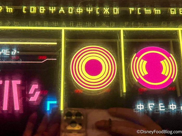 Shifting over to EPCOT’s newest E-Ticket attraction, it makes sense that Guardians of the Galaxy: Cosmic Rewind has so many shoutouts to the former Ellen’s Energy Adventure/Universe of Energy ride, since this coaster is housed where this retired ride once resided. A column inside the ride features script written in the fictional Xandarian language. If you translate it to English, the top left says Ellen, the top right says Alex (as in Alex Trebek — who was also featured in the ride), the bottom left says E=MC squared, and the bottom right says dino. In addition, if you look closely at a set of ship schematics featured in the second pre-show room, at the bottom right, you can see the old Universe of Energy symbol.