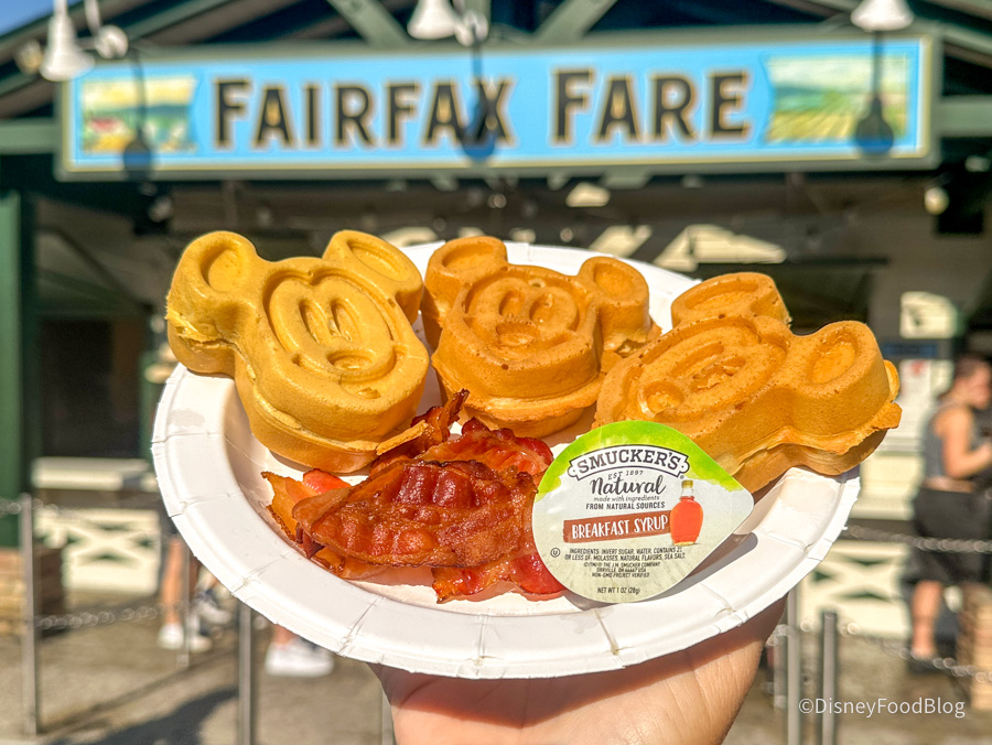 We stopped by Fairfax Fare at Disney’s Hollywood Studios for some breakfast, where you can get a Mickey Waffle Platter (and a mimosa!) as long as you order before they switch to lunch service. We picked up the Mickey Waffle Platter this time around, which is $9.49 and comes with syrup and a side of bacon.
