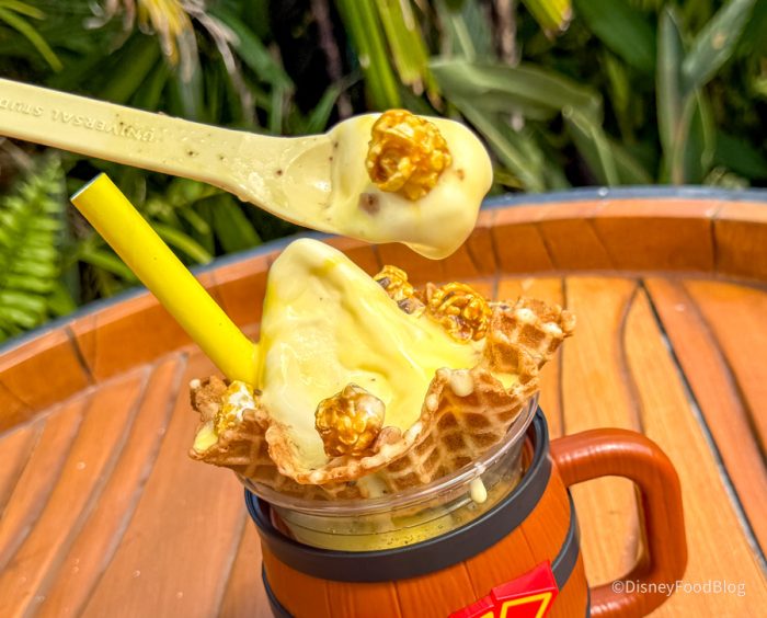 This was shockingly delicious — not to mention, it is adorable. It’s so perfectly themed for the land, and not only that, it is so tasty, too. It’s essentially a banana-pineapple DOLE Whip float, and we couldn’t get enough. As the DOLE Whip melts, it goes into the soda, and it gets creamy, tangy, and delicious. We love how creative they were with this treat, and this is exactly what we wanted to see from Epic Universe in terms of unique treats. The textures — the crunchiness of the caramel corn and the chocolate — and the tanginess of the pineapple with the sweetness of the banana just go so well together.