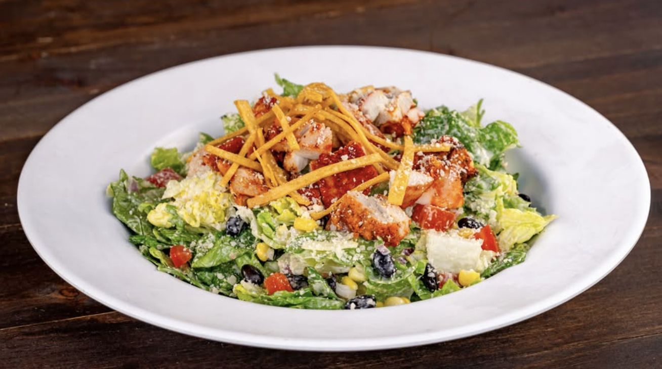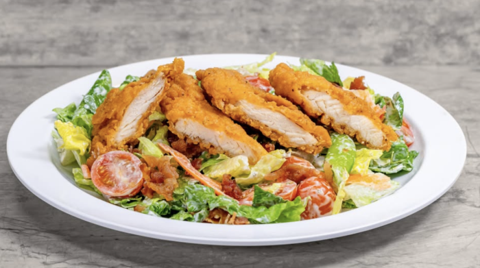 The Race Day Salad at Flo’s V8 Cafe is for chicken tender lovers! That’s because it’s made with fresh romaine lettuce topped with golden crispy chicken, crisp snap peas, shaved carrot, zesty ranch dressing, shredded parmesan, and chopped bacon.