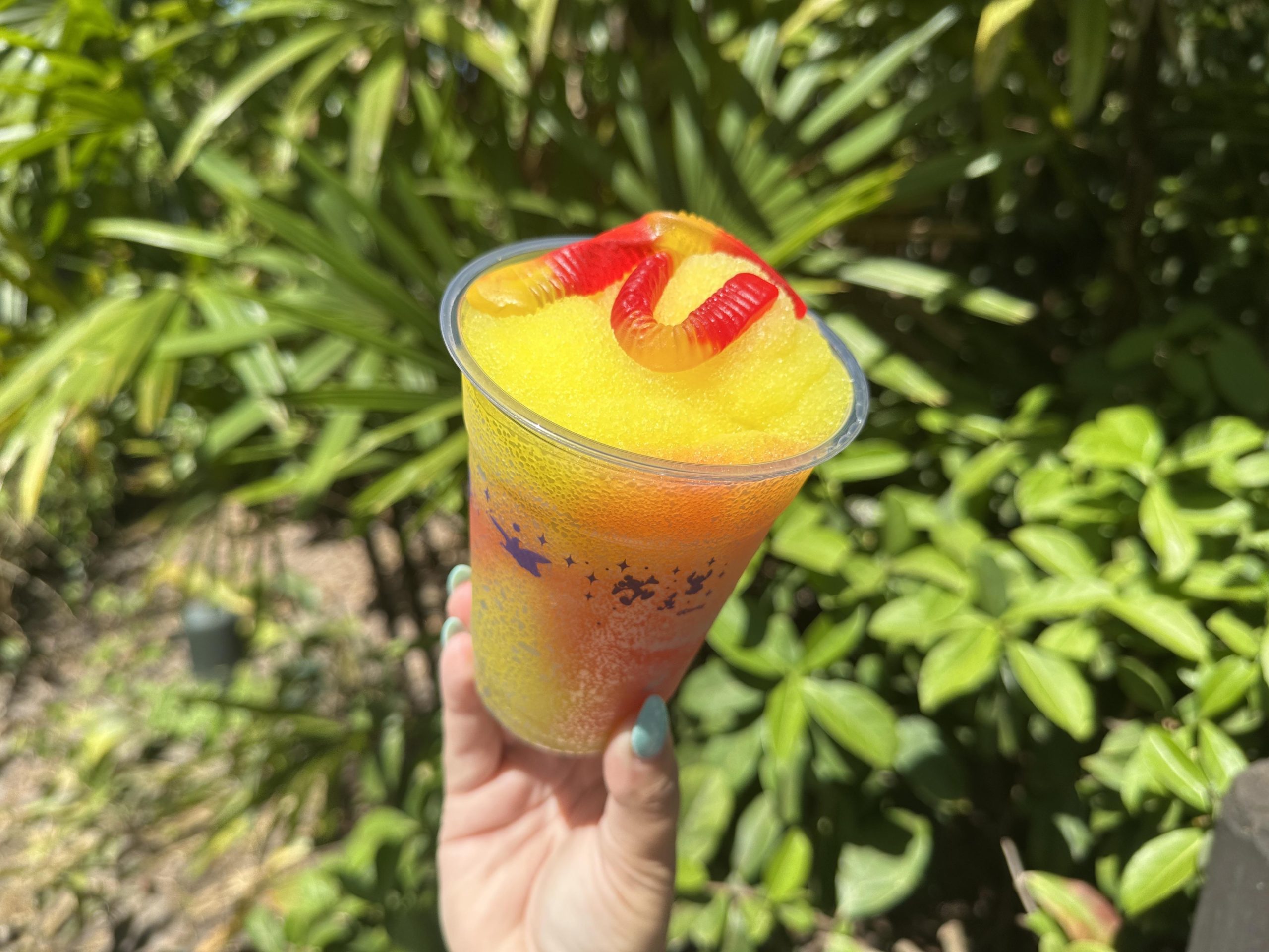 Timon and Pumbaa would definitely approve. When we look at a sip, it tastes like a sweeter pineapple flavor. It’s more mango at the end of the sip, but the sweet grenadine is what comes through with every sip. We thought the gummy worms on top were fun, and when you’re looking for a slushy to switch it up from the traditional blue raspberry or cherry, this will definitely do the trick.