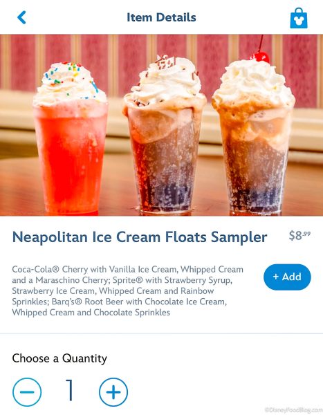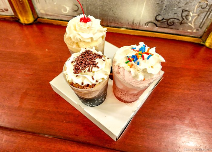 We recently made a trip to Golden Horseshoe in Disneyland Park to try out the new Neapolitan Ice Cream Floats Sampler for $8.99.