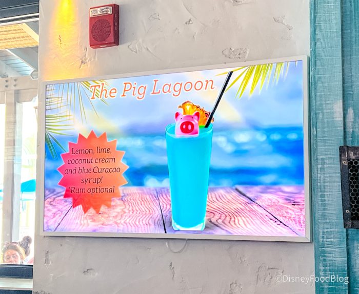 We stopped by The Polite Pig at Disney Springs to check out their new drink for the summer — the Pig Lagoon! It’s made with lemon, lime, coconut cream, and blue Curacao syrup, and you can get it with or without rum. First of all, how ADORABLE is this?!