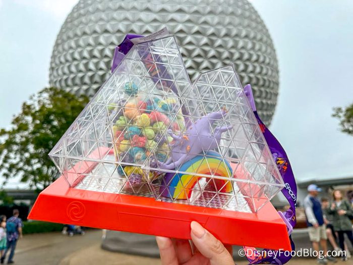 In 2024, another spectacular bucket was the Imagination Pavilion bucket, which featured Figment diving into a rainbow of popcorn.